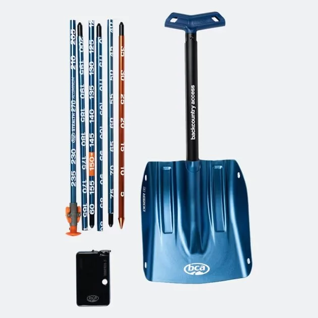 Avalanche tranceiver, showel and probe